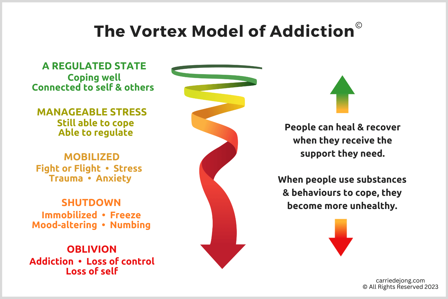 The Vortex Model of Addiction provides a way of understanding the move into addictive patterns with substances or behaviours. It speaks to the progressive nature of substance use and addiction disorders. Those who struggle can attest to how addiction's impacts grow over time. But this model also speaks to the progressive nature of trauma symptoms. Lastly, the Vortex Model also speaks to the process of recovery.